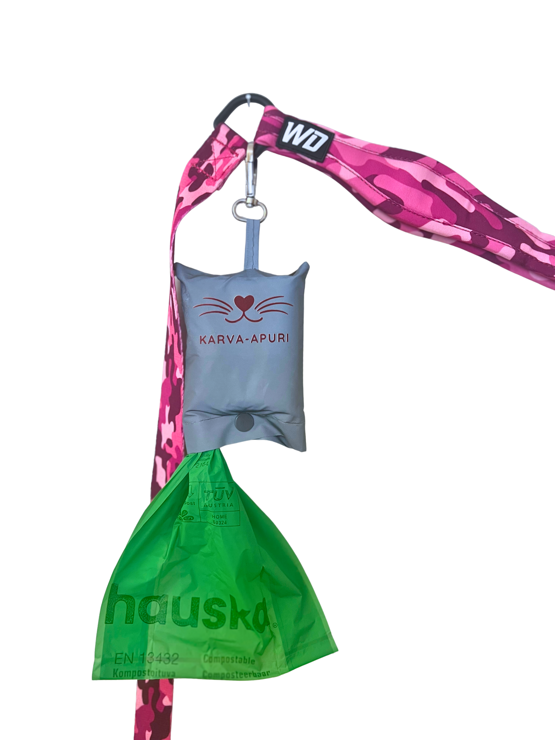 Kiinnitä pidike taluttimeen tai hihnaan, laita rulla sisään ja ota pussi käyttöön tarvittaessa. Toimii erinomaisesti perus lenkeillä, treeneissä ja reissuilla – erityisesti silloin, kun haluat pitää kädet vapaina.